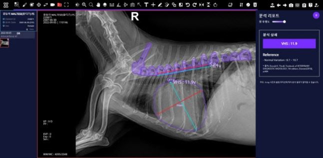 SK텔레콤 동물 의료 AI 서비스인 ‘엑스칼리버’를 통해 분석한 반려견의 VHS(심장크기측정) X-레이 사진. 이상 SK텔레콤 제공
