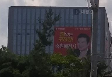 서울 강서구 발산역 이대서울병원 옆 건물에 붙인 김태우 서울 강서구청장 국민의힘 후보 선거 플랜카드. 정기홍 기자