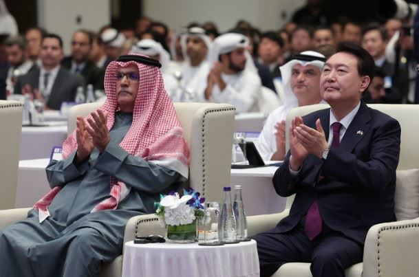 아랍에미리트(UAE)를 국빈 방문 중인 윤석열 대통령이 아부다비 한 호텔에서 열린 한-UAE 비즈니스 포럼에서 박수치고 있다. 대통령실 제공