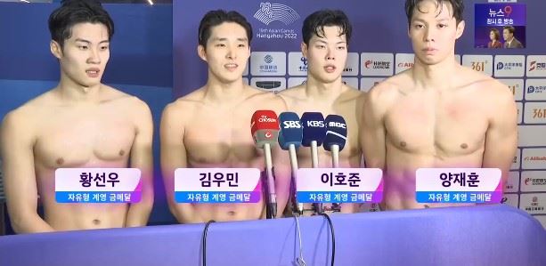 한국 남자 계영 800m 대표팀은 25일 중국 저장성 항저우 올림픽센터 수영장에서 열린 2022 항저우 아시안게임 수영 경영 남자 계영 800m 결선에서 양재훈(25), 김우민(22), 황선우(20·이상 강원도청), 이호준(22·대구시청)이 출전해 7분 01초 73으로 아시아 신기록을 갈아치우며 1위를 했다. 2위는 중국, 3위는 일본이었다.
