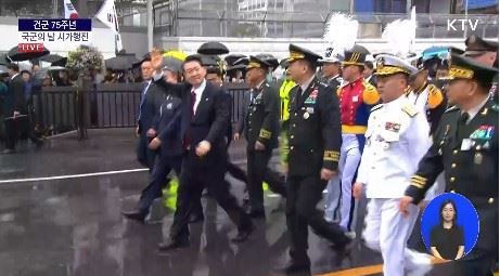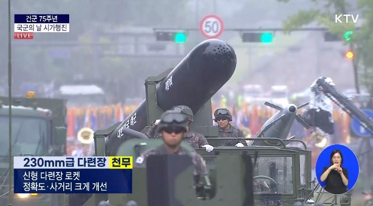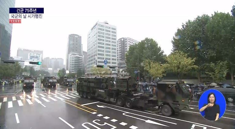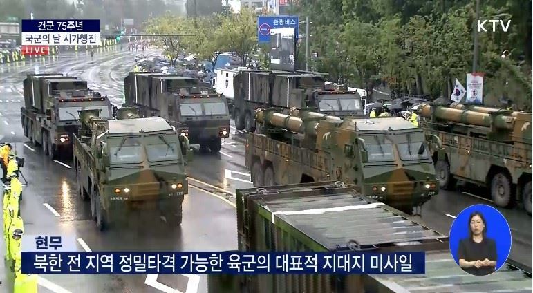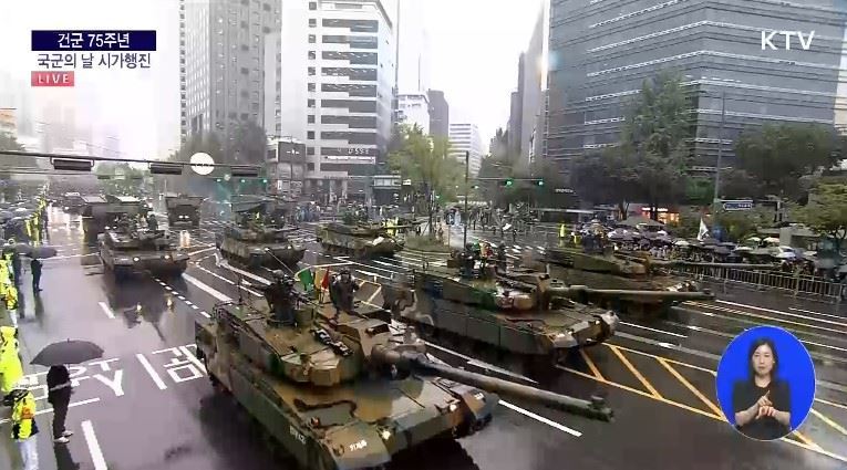 가을비가 촉촉히 내리는 가운데 열린 기념 행사에는 공군의 F-35A 스텔스 전투기와 세계 최정상급 전차인 K2 흑표 전차, 북핵 억제의 핵심인 고위력 탄도미사일 등 군의 최첨단 전력이 총출동 했다.