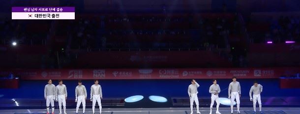 이날 1라운드에서 한국은 오상욱이 4-5로 리드를 빼앗겼지만 2라운드에서 구본길이 10-8로 역전에 성공했다. 3라운드에서 김준호가 15-9로 점수를 벌렸다.