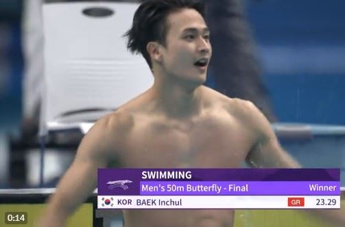 아시안게임 수영 남자 접영 50m에서 금메달을 딴 백인철 선수가 환호하고 있다. X(옛 트위트) 캡처