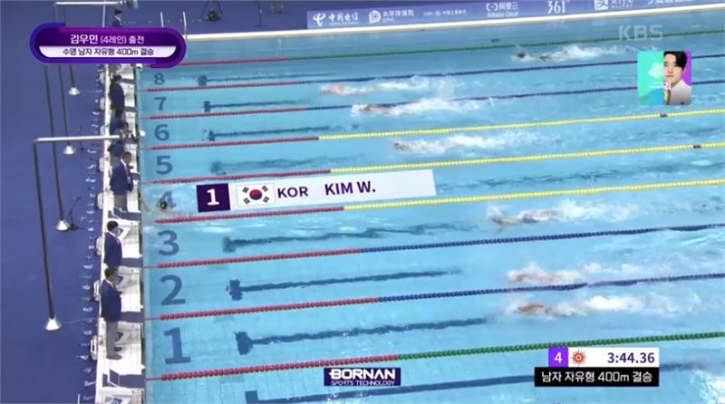 김우민이 1위로 결선선을 터치하고 있다. KBS 중계 캡처