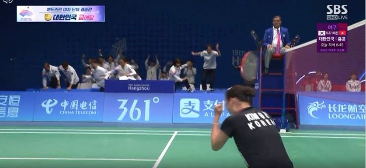 김가은이 1일 중국 항저우 빈장체육관에서 열린 2022 항저우 아시안게임 배드민턴 여자 단체 결승 중국과의 경기에서 허빙자오를 이긴 뒤 환호하고 있다. 안세영이 이끄는 여자 배드민턴 대표팀들이 1994년 히로시마 대회 이후 29년 만에 단체전 금메달을 따자 기뻐하며 매트로 내려오고 있다. SBS 경기 중계 캡처