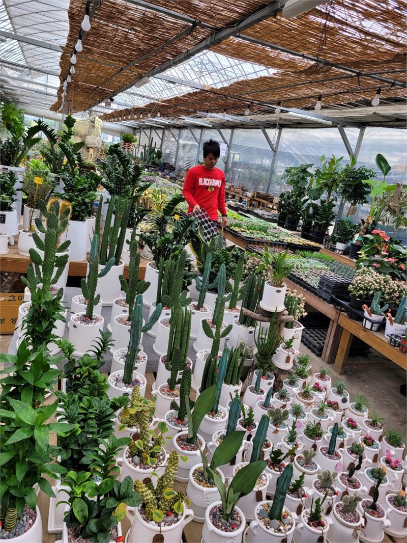 제각각의 화분에 담긴 선인장을 화분에 담아 옮기는 직원의 모습도 보이네요.