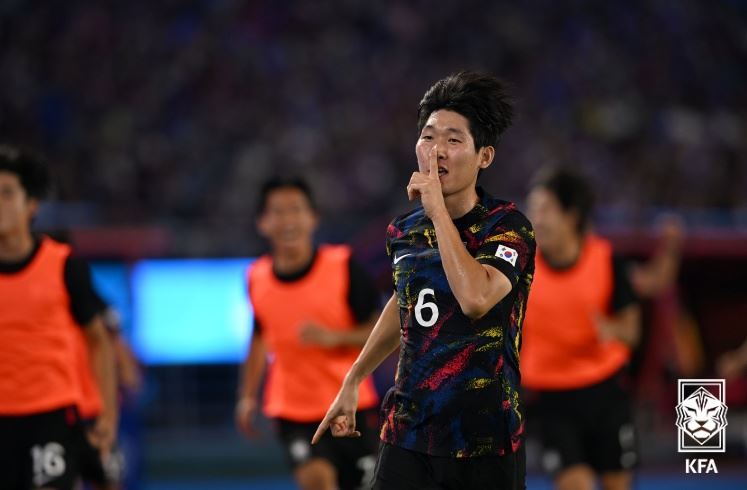 송민규가 중국과의 8강전에서 1-0으로 앞선 전반 추가골을 넣은 뒤 기뻐하고 있다. 이상 대한축구협회