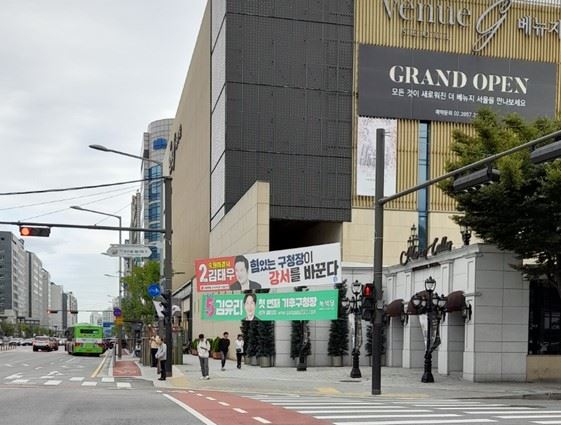 국민의힘 김태우 후보자와 녹색당 김유리 후보자의 플랜카드