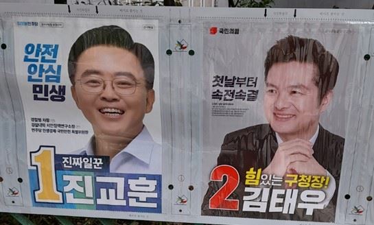 사실상 양자 게임으로 여겨지는 진교훈 민주당 후보자와 김태우 후보자의 선거 벽보 모습