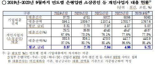 하지만 소상공인 등 개인사업자의 대출 평균금리는 2020년 2.70%→2021년 2.94%→2022년 4.96%→2023년 9월 말 5.21%로 증가 폭이 더 가파르다.