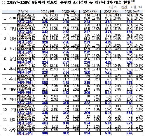 올해 9월 말 기준 소상공인 등 개인사업자의 대출잔액이 가장 많은 은행은 국민은행으로 87조 8000억 원(8월 말 기준)이며, 대출건수는 농협은행(74만 건, 9월 말 기준)으로 가장 많았다.