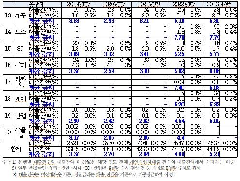 20개 은행 중 국민·우리·신한·하나·SC·산업은행은 9월 말 결산 전이어서 8월 말 수치다.