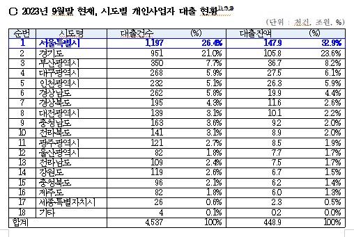 시도별로는 서울시가 대출건수 119만 7000건에 대출잔액 147조 9000억 원으로 가장 많았으며, 다음으로 경기도(95만 1000건, 잔액 105조 8000억 원) 등의 순이다.