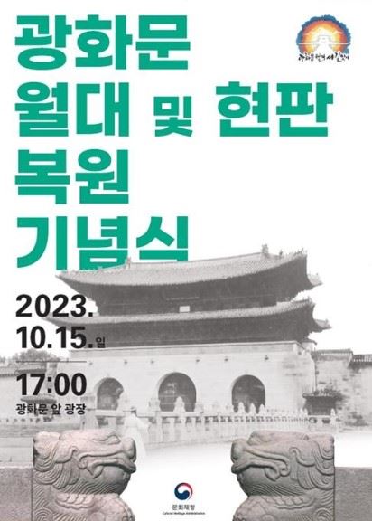 문화재청은 오는 15일 오후 5시부터 광화문 앞 광장에서 광화문 월대(越臺-月臺·중요한 건물에 넓게 설치한 대)와 현판 복원 기념 행사를 연다고 13일 밝혔다.