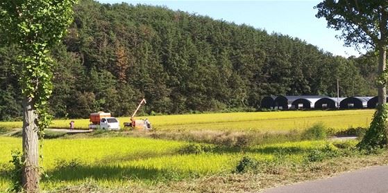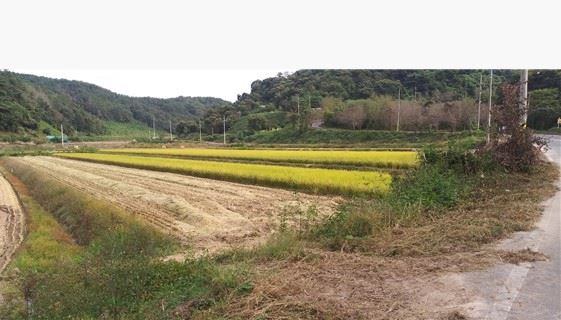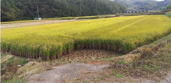 벼를 베는 콤바인이 들어가도록 벼논 입구엔 낫으로 일정 부분을 베어놓은 모습.