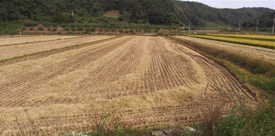 누런 벼가 있는 논과 콤바인으로 벼를 수확한 논의 모습이 대비된다.