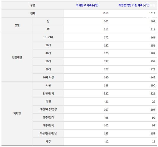 이번 여론조사의 오차 범위는 95% 신뢰 수준에서 ±3.1%포인트다. 조사는 통신3사가 제공한 휴대전화 가상(안심)번호를 100% 이용한 전화면접으로 진행했다. 응답률은 10.1%다.