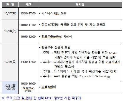 KAI는 ADEX 기간 동안 다수의 국내외 전문업체들과 미래사업을 위한 기술제휴, 사업협력 MOU를 체결 예정이며 유럽, 북미, 남미, 아시아 등 해외 고객들과의 면담을 통해 수출 확대를 모색한다.
