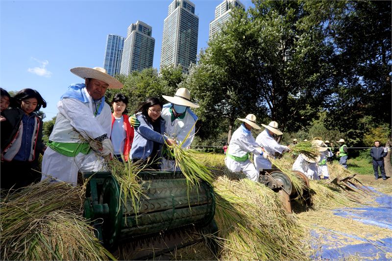 지난 20일 오전 10시 서울 강남구 영동4교 부근 양재천 벼농사 학습장에서 ‘전통 가을걷이 체험행사’가 열렸다.