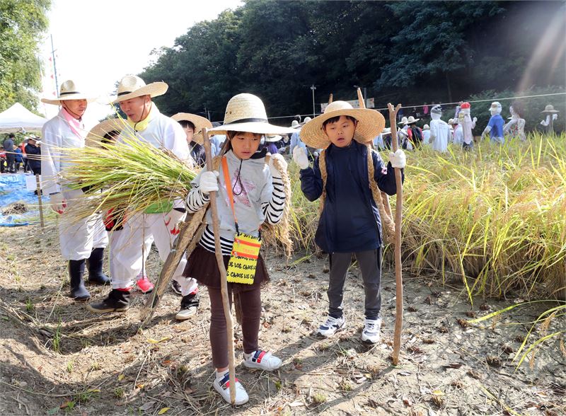 옛 방식에 따라 낫으로 벼를 베고, 홀태와 족답식탈곡기 등 전통 농기구를 이용한 탈곡과 타작, 볏단 나르고 쌓기 등 농촌의 가을걷이 풍습을 체험했다.