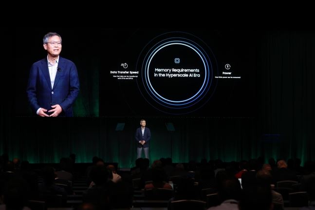 삼성전자 메모리사업부 이정배 사장이 20일(현지 시각) 미국 실리콘밸리에서 열린 '삼성 메모리 테크 데이 2023'에서 초고성능 D램 'HBM3E'를 발표하는 모습. 삼성전자 제공