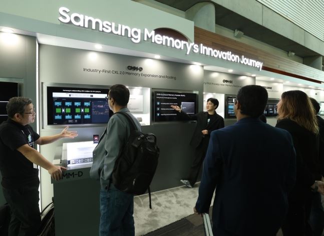 '삼성 메모리 테크 데이 2023' 현장 부스. 삼성전자 직원들이 관람객들에게 설명을 하고 있다. 삼성전자 제공