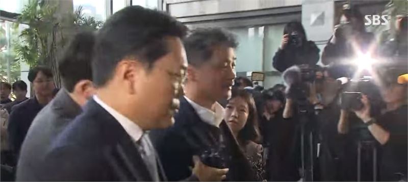 김범수 창업주(가운데)가 금감원에 출석하면서 기자들의 카메라 세례를 받고 있다. SBS뉴스