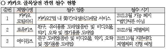 또 카카오는 지난 2021년 계열사 확장에 따른 골목상권 침해를 국정감사에서 지적을 받자 증인으로 나온 김범수 창업자는 "일부는 이미 철수를 시작했고 일부는 지분 매각에 대한 얘기를 검토하고 있고 좀더 속도를 내겠다"고 답했다.