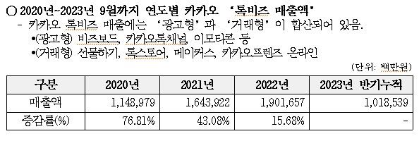실제 지난 2020~2023년 6월 카카오 ‘톡비즈’ 매출액을 보면 2020년 1조 1489억 7900만 원, 2021년 1조 6439억 2200만 원(+43.08%), 2022년 1조 9016억 5700만원(+15.68%)으로 매년 가파르게 증가하고 있다.
