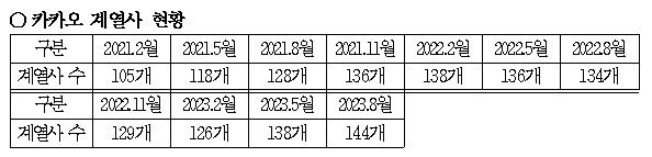 특히 카카오 김성수 이사회 의장이 지난해 4월에 그해 연말까지 30~40개를 줄이겠다고 공언했지만 지난해 2월 기준 138개보다 6개나 증가했다.