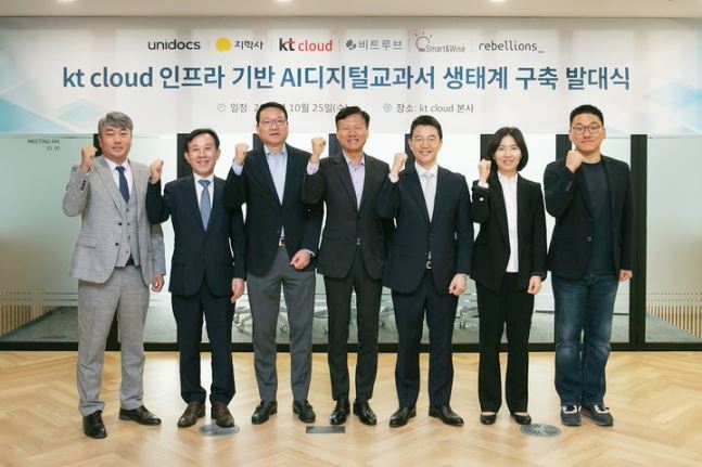 KT클라우드는 리벨리온, 비트루브, 스마트앤와이즈, 유니닥스, 지학사와 함께 '인프라 기반 인공지능(AI) 디지털교과서 생태계 구축 발대식'을 27일 가졌다고 밝혔다.
