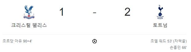 토트넘은 후반 8분 상대 자책 선제골을 얻었다. 문전 안에서 매디슨이 크로스한 볼이 크리스탈 팰리스 수비수 워드 맞고 굴절되며 골문 안으로 들어갔다.