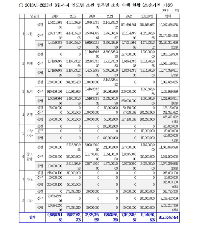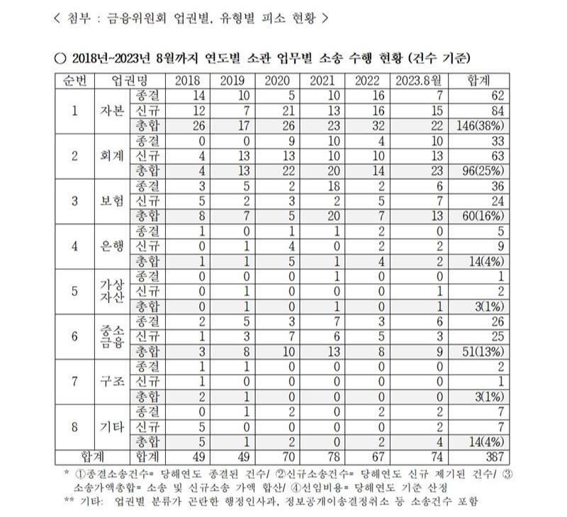 금융위 대상 소송 제기건을 소관 업무권역별로 보면 '자본시장법'상 공시의무, 증권신고서 제출의무 등 위반에 대한 제재 관련 '자본' 업권이 146건(38%/ 소송가액 341억 9430만 1686원)이 가장 많았다.
