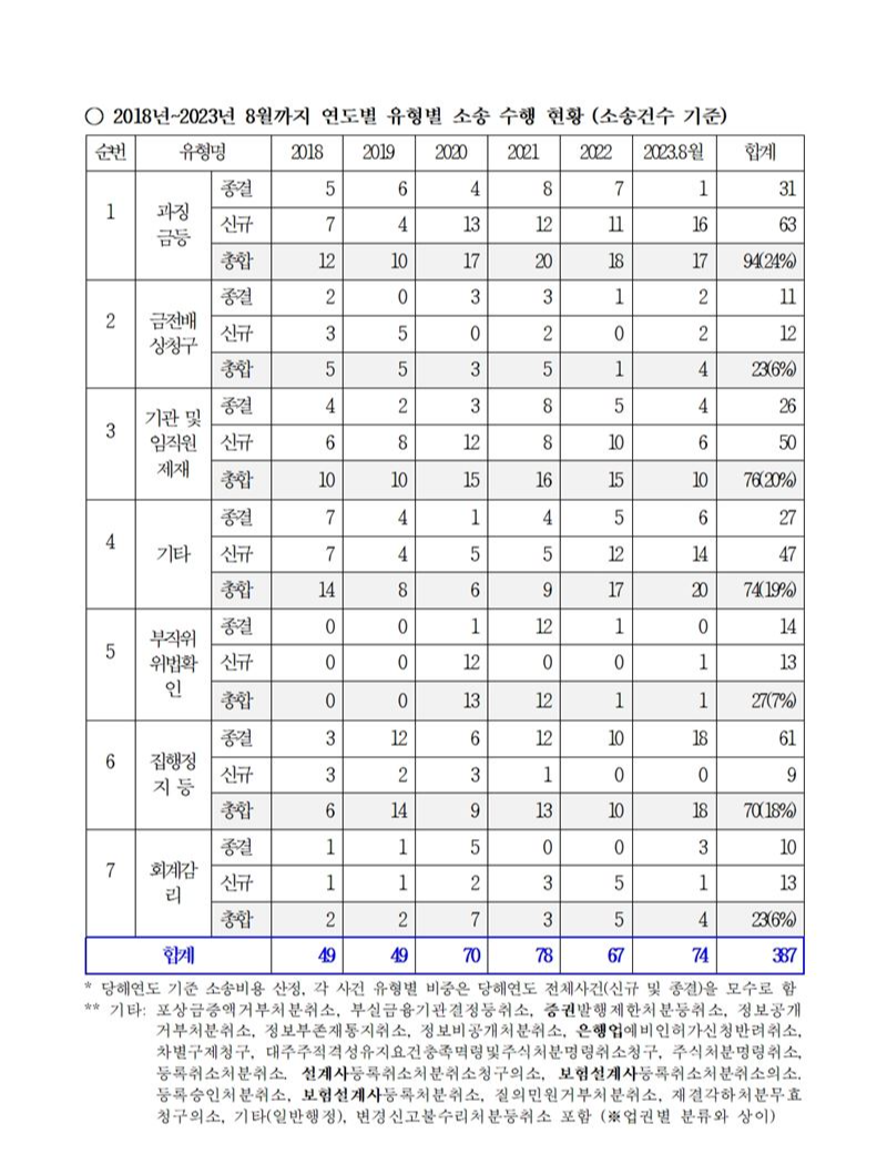 국회 강민국 의원실(경남 진주시을)이 금융위로부터 받은 '금융위원회 업권별, 유형별 피소 현황'을 보면 지난 2018~2023년 8월 금융위를 대상으로 제기된 소송 건수는 총 387건에 소송가액은 무려 807억 1247만 7474원에 달한다.