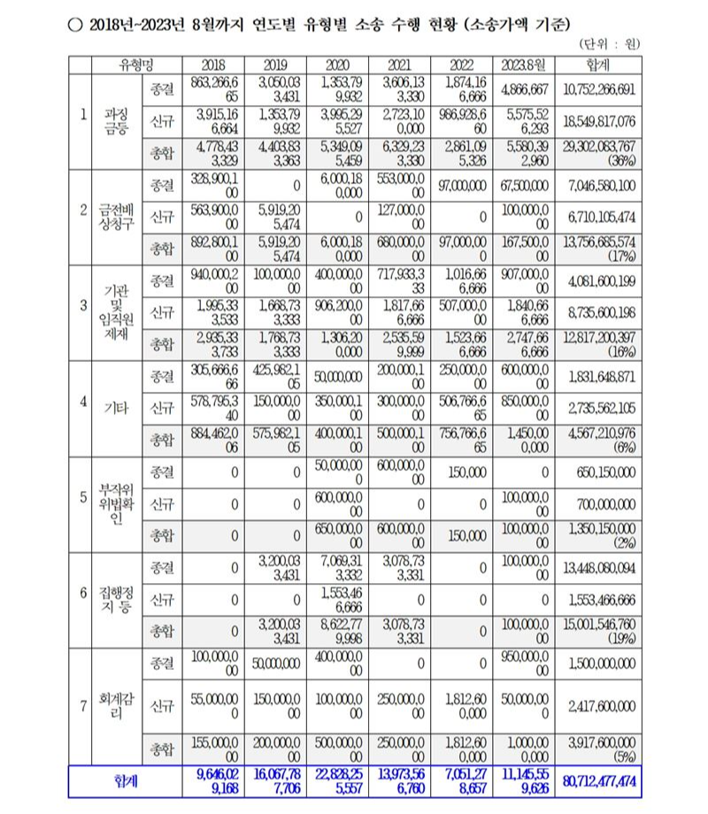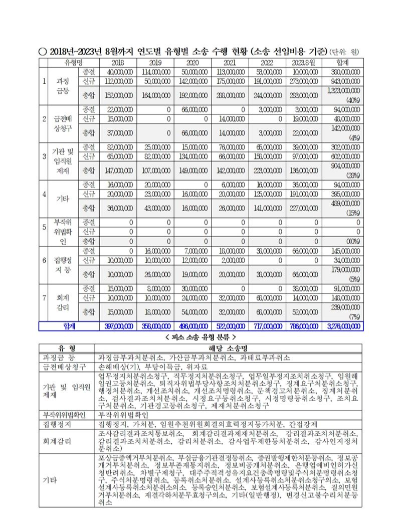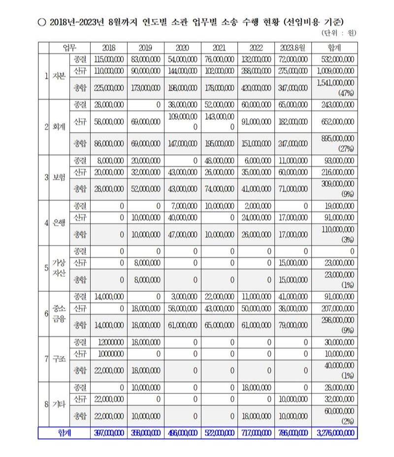 실제 지난 6년여간 금융위가 피소건으로 집행한 예산은 무려 32억 7600만 원에 달하며 ▲2019년 3억 5800만 원 ▲2020년 4억 9600만 원 ▲2021년 5억 2200만 원 ▲2022년 7억 1700만 원 ▲2023년 8월까지 7억 8600만 원으로 매년 증가하고 있다 .