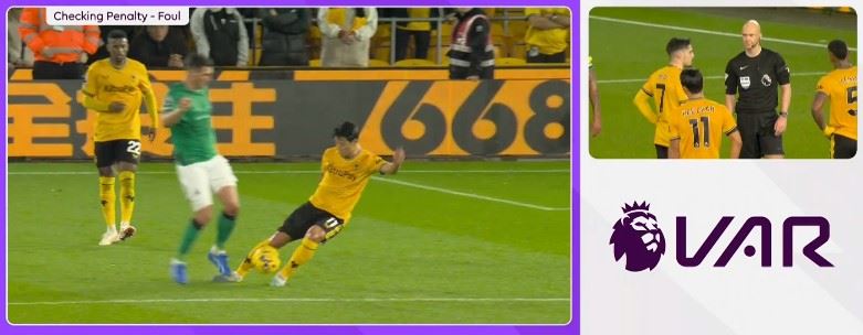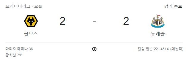 하지만 울버햄프턴은 전반 추가 시간에 황희찬이 페널티킥을 내주면서 실점해 2-1로 끌려갔다. 페널티 지역에서 전진하려던 황희찬의 볼 터치가 길어지면서 뉴캐슬의 파비안 셰어의 발목을 걷어찼다. 비디오판독(VAR) 결과 페널티킥 판정이 나왔다.