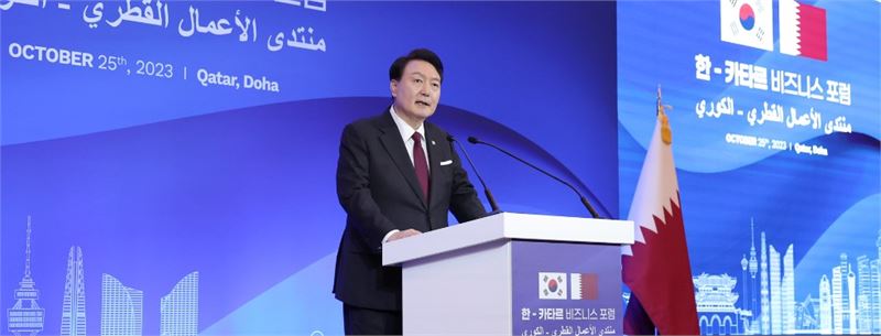 윤석열 대통령이 지난 25일(현지 시각) 한국-카타르 비즈니스 포럼에서 연설을 하고 있다. 대통령실