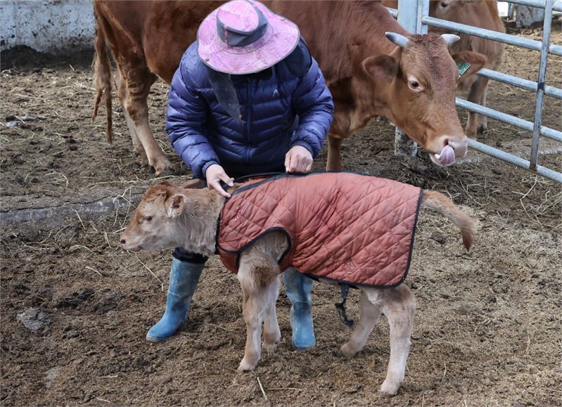 한 축산농장주가 송아지용으로 맞춘 방한복을 입히고 있다. 경남 함양군 제공