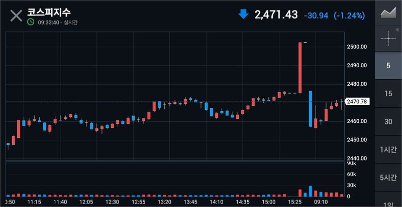 이날 오전 9시 5분 현재 코스피는 전장보다 44.15포인트(1.76%) 하락한 2458.22다.