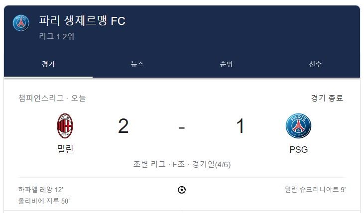 PSG는 전반 9분 만에 수비수 밀란 슈크리니아르가 세트피스 상황에서 헤딩골로 1-0 앞섰지만 3분 만에 AC밀란의 하파엘 레앙에게 선제골을, 후반 5분 올리비에 지루에게 허용해 역전당했다.