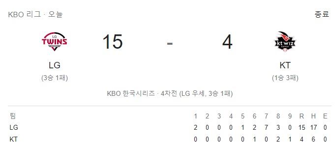 LG는 수원 케이티위즈파크에서 열린 한국시리즈 4차전에서 1회 김현수의 2점 홈런과 5회 홍창기의 적시타로 초반 승기를 잡은 데 이어 7회에만 오지환의 2경기 연속 3점 홈런 포함, 8타자 연속 안타로 7점을 집중시킨 끝에 15대 4로 대승을 거뒀다.
