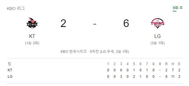 정규시즌 1위로 KS에 직행한 LG는 1차전에서 2-3으로 석패했지만, 2~5차전을 내리 이겨 우승을 확정지었다.