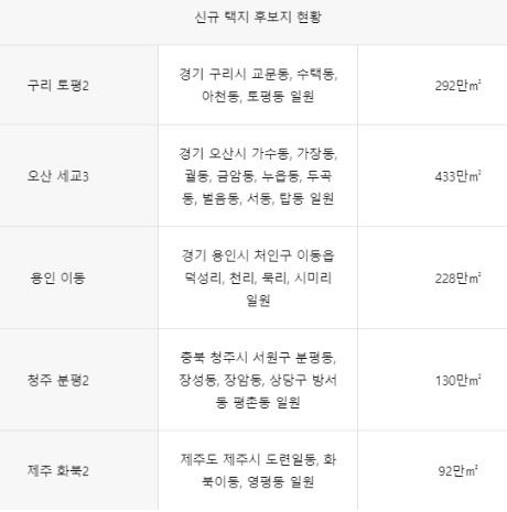 정부가 경기 구리시·오산시·용인시와 충북 청주시, 제주시 등 5개 지역에 8만 가구 규모의 신규 택지를 조성한다. 오믄 2025년 상반기까지 지구지정이 끝내고, 2027년 상반기부터 사전청약과 주택 사업 계획 승인을 한다.