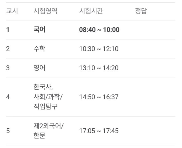 2024학년도 수능시험 시간표