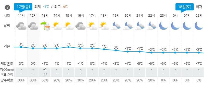 17일 아침 기온은 영하 4도까지 떨어지겠다. 낮 최고기온은 영상 2~12도가 예상된다. 평년의 최저 2도, 최고 11도보다 낮다. 대부분 지역에서 초속 15m 이상의 강풍이 불어 체감온도는 더 떨어진다.