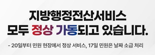 ‘정부24’는 전날 오전 9시 재개된 뒤 현재 원활하게 작동 중이다. 새올 지방행정 정보시스템의 경우 지자체와 현장점검 중이며 현재까지 양호한 것으로 나타났다.