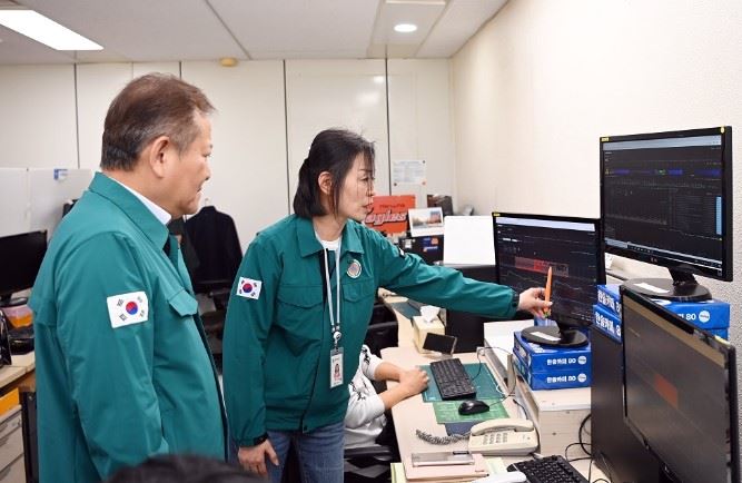 이상민 행안부 장관이 19일 오전 국가정보자원관리원을 방문해 정부 행정 전산망 오류 사태 복구 상황을 점검하고 있다.
