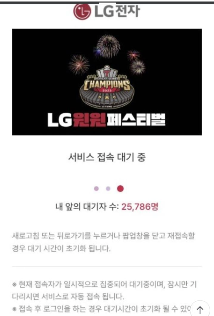 LG전자가 LG 트윈스의 한국시리즈 29년 만의 우승을 기념해 21일 시작한 가전제품 29% 특별 세일 이벤트에 수만 명이 몰리면서 홈페이지가 마비됐다.