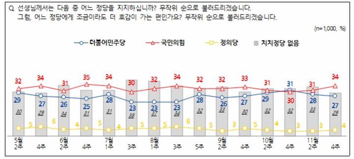 민주당 지지율은 10월 4주(31%)→11월 2주(28%)→11월 4주(27%) 하락세로 이어졌다.