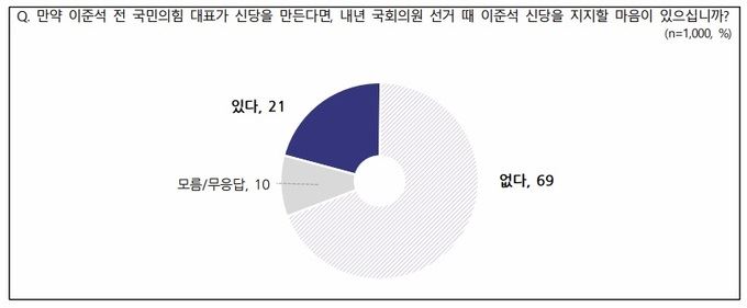 여론조사 전문 업체인 엠브레인퍼블릭·케이스탯리서치·코리아리서치·한국리서치가 23일 공동 발표한 ‘전국지표조사’ 결과에 따르면 응답자의 21%만 '이준석 신당' 창당 시‘ 지지할 마음이 있다’고 답했다. ‘지지할 마음이 없다’는 응답자는 69%였고 ‘모름·무응답’은 10%였다. 지난 20~22일 만 18세 이상 남녀 1000명을 대상으로 조사를 했다.